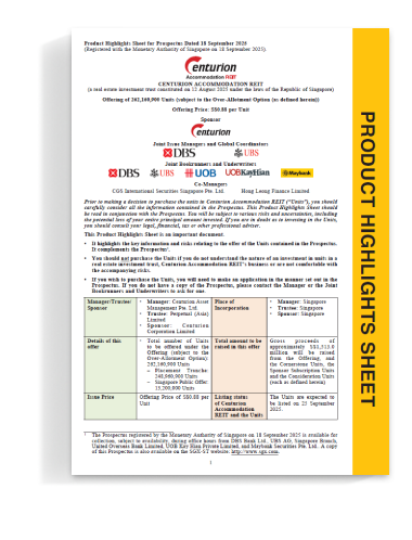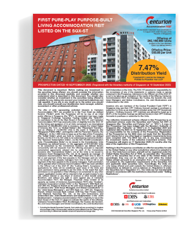 Centurion Accommodation REIT ("CAREIT") is a real estate investment trust ("REIT") established with the principal investment strategy of investing, directly or indirectly, in a portfolio of income-producing real estate assets which are used primarily for purpose-built worker accommodation ("PBWA") purposes, purpose-built student accommodation ("PBSA") purposes or other accommodation purposes located globally (excluding Malaysia), as well as real estate-related assets. Other accommodation purposes include, but are not limited to, build-to-rent, co-living, senior housing and other accommodation assets used primarily for longer stays.